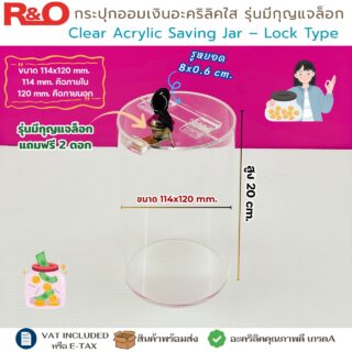 กระปุกออมเงินอะคริลิคใส รุ่นมีกุญแจล็อก ขนาด 114x120 mm. สูง 20 cm.