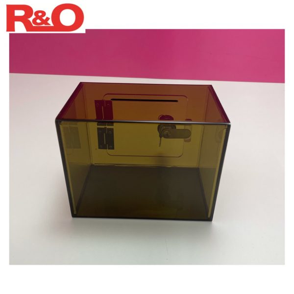 กล่องรับบริจาคสีชาโปร่งแสงขนาด18x12xสูง14cm.