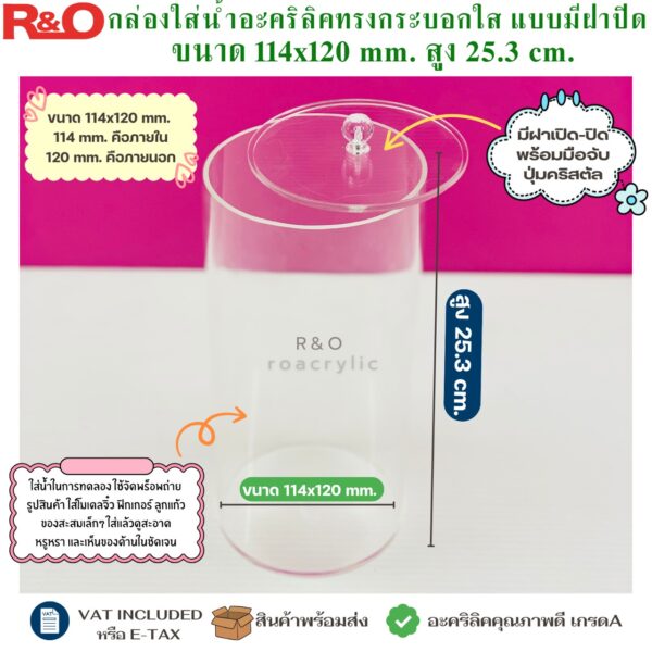 กล่องอะคริลิคใสทรงกระบอก รุ่นฝาปุ่มคริสตัลใส ขนาด 114×120 mm. สูง25.3 cm.