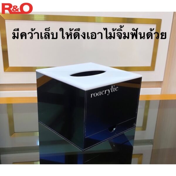 กล่องใส่กระดาษทิชชู PoP-Up รุ่นมีกล่องใส่ไม้จิ้มฟันด้านล่าง สีดำ-ขาว ขนาด 13.5×13.5×10 cm.