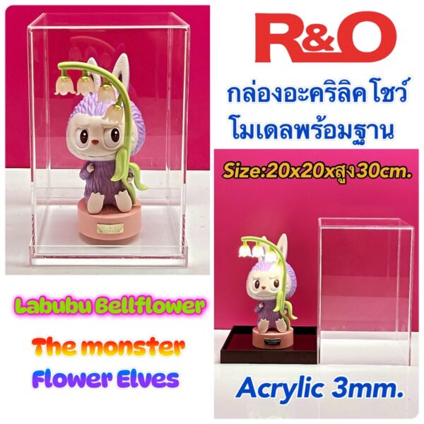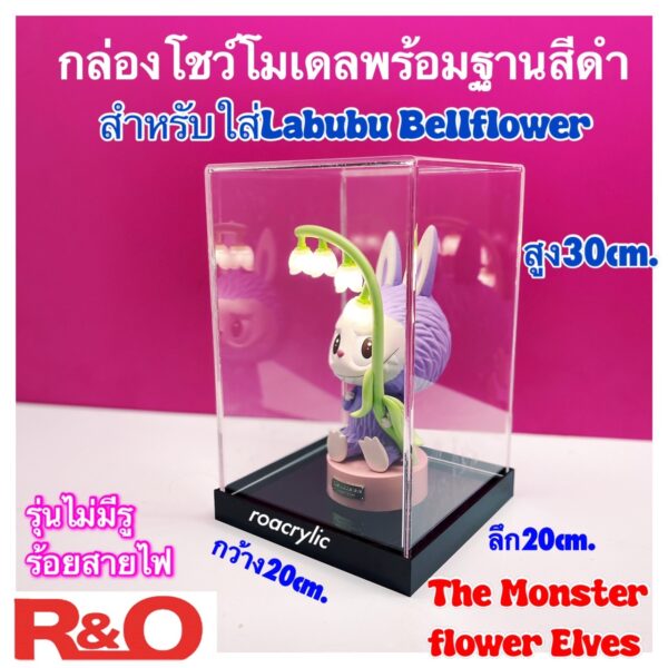กล่องใส่ Labubu Bellflower THE MONSTERS Flower Elves สีใส ฐานดำ ไม่มีรูร้อยสายไฟ ขนาด20x20xสูง30cm.