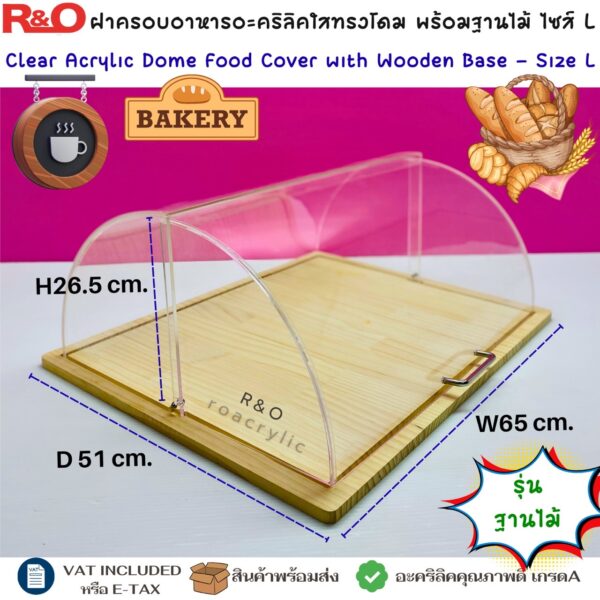 ฝาครอบอะคริลิคใสทรงโดม ฝาครอบอาหารอะคริลิคใสทรงโค้ง ไซส์ L ฐานไม้