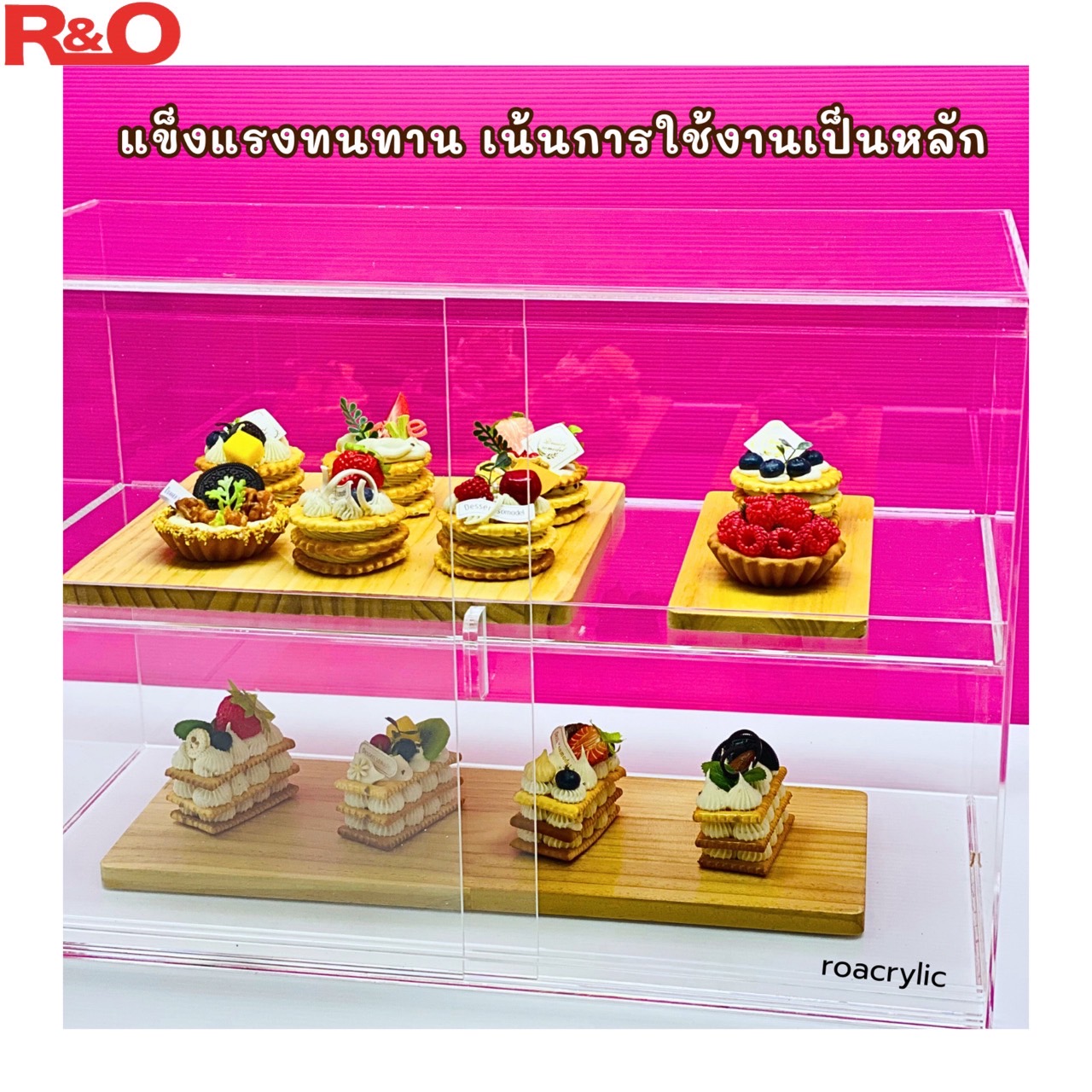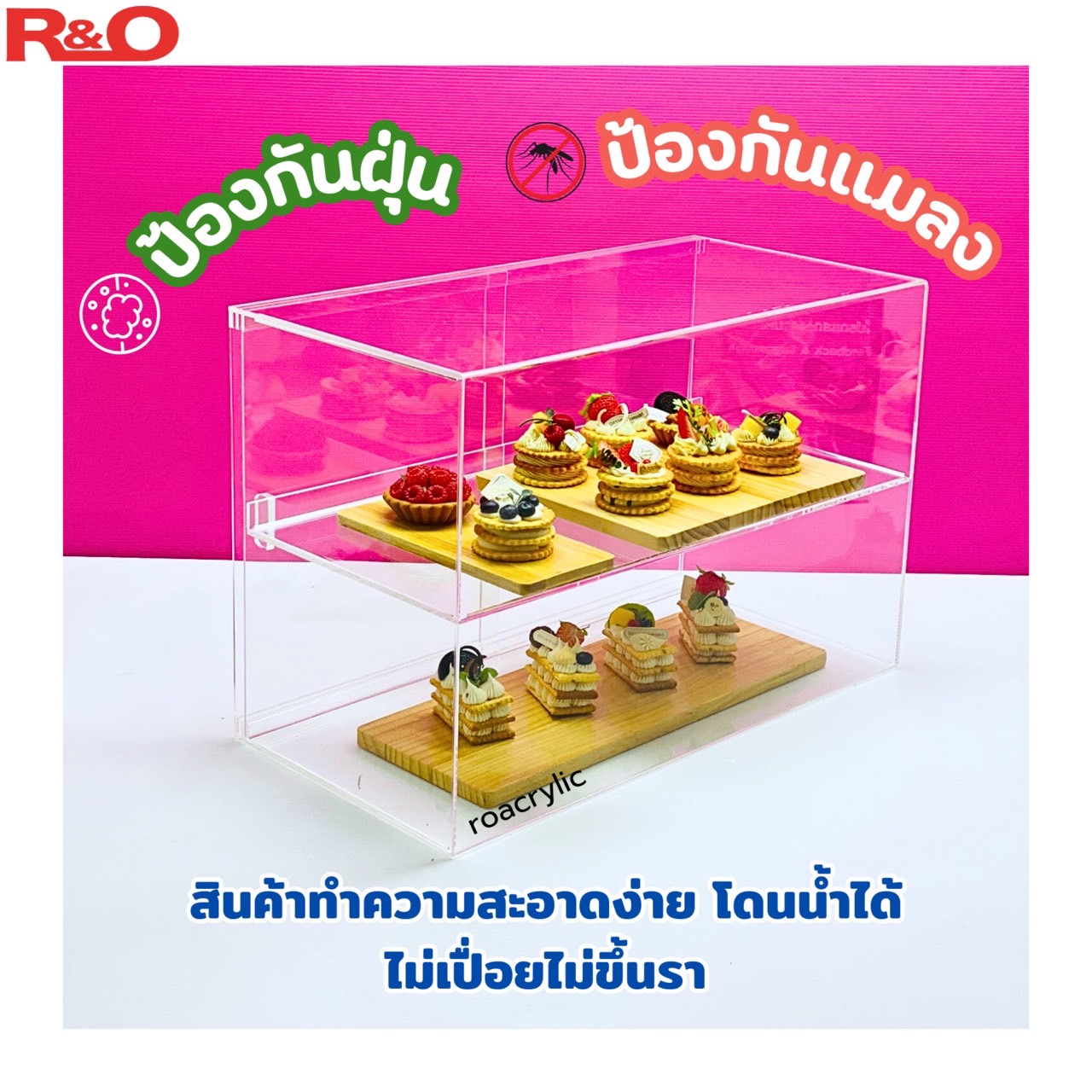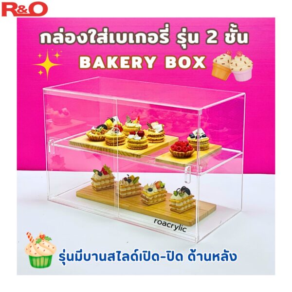 roacrylic กล่องใส่เบเกอรี่ Bakery box ใส่ขนมปัง แบบ 2 ชั้น รุ่นมีบานสไลด์เปิด-ปิด ด้านหลัง ขนาดกว้าง80xลึก30xสูง50 cm.